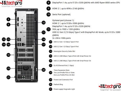- Mặt sau: HDMI 2.1, DisplayPort™ 1.4a, RJ45 1Gbps, USB 3.2, VGA và nhiều tùy chọn mở rộng.