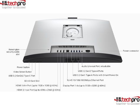 Right: · 1 USB 3.2 Gen 2 port with PowerShare · Left: · 1 Universal audio port Below Display: · 1 SD 4.0 card slot · 1 USB 3.2 Gen 2x2 Type-C® port Back panel: · 2 USB 3.2 Gen 2 ports · 2 USB 3.2 Gen 1 ports with Smart Power On · 1 audio line-out port, retaskable · 1 DisplayPort++ 1.4a/HDCP 2.3 port, up to 5120 x 3200 @ 60Hz · 1 HDMI-in 1.4b/HDCP 1.4 port, up to 1920 x 1080 @ 60Hz · 1 HDMI-out 2.1/HDCP 2.3 port, up to 4096 x 2160 @ 60Hz · 1 RJ45 Ethernet Port 10/100/1000 Mbps port |