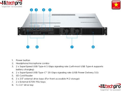 - 1 khay ngoài 3.5 inch (có thể cấu hình với 1 ổ cứng 3.5 inch hoặc bộ chuyển đổi hỗ trợ hai ổ M.2 bổ sung).